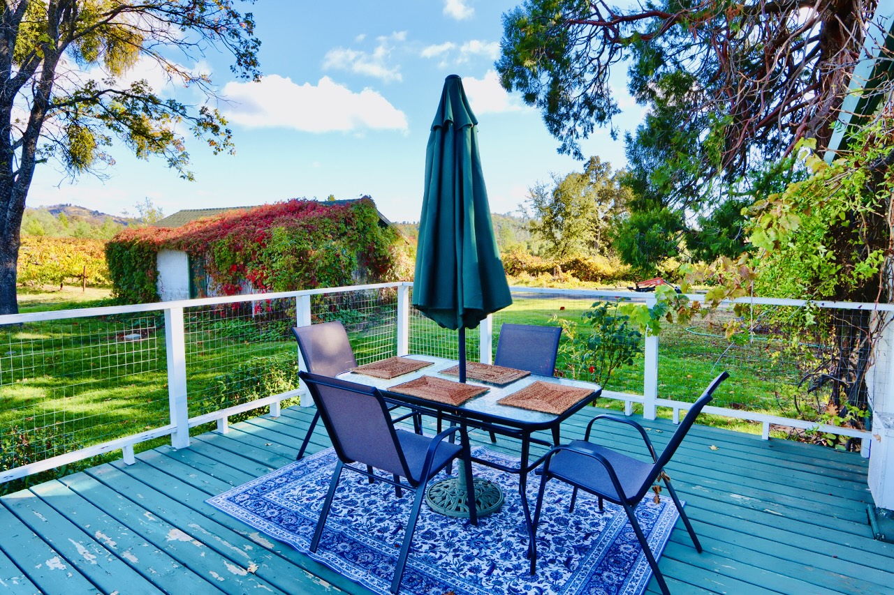 The outdoor spaces at Cabernet Cottage each offer their own special mood. In the front, the porch has the welcoming charm of a farmhouse tucked into the hills — the perfect place to sit and enjoy the peaceful surroundings. In the back, the deck opens toward the vineyard, creating a more open and scenic setting for coffee in the morning, a glass of wine in the evening, or simply taking in the beauty of the vines and changing light.